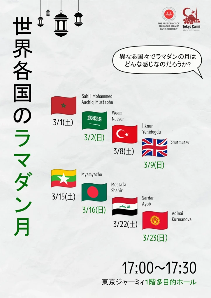 ラマダーン月の間、東京ジャーミィでは週末に世界各国のラマダーン月についてのお話会があります。どうぞご参加下さい。