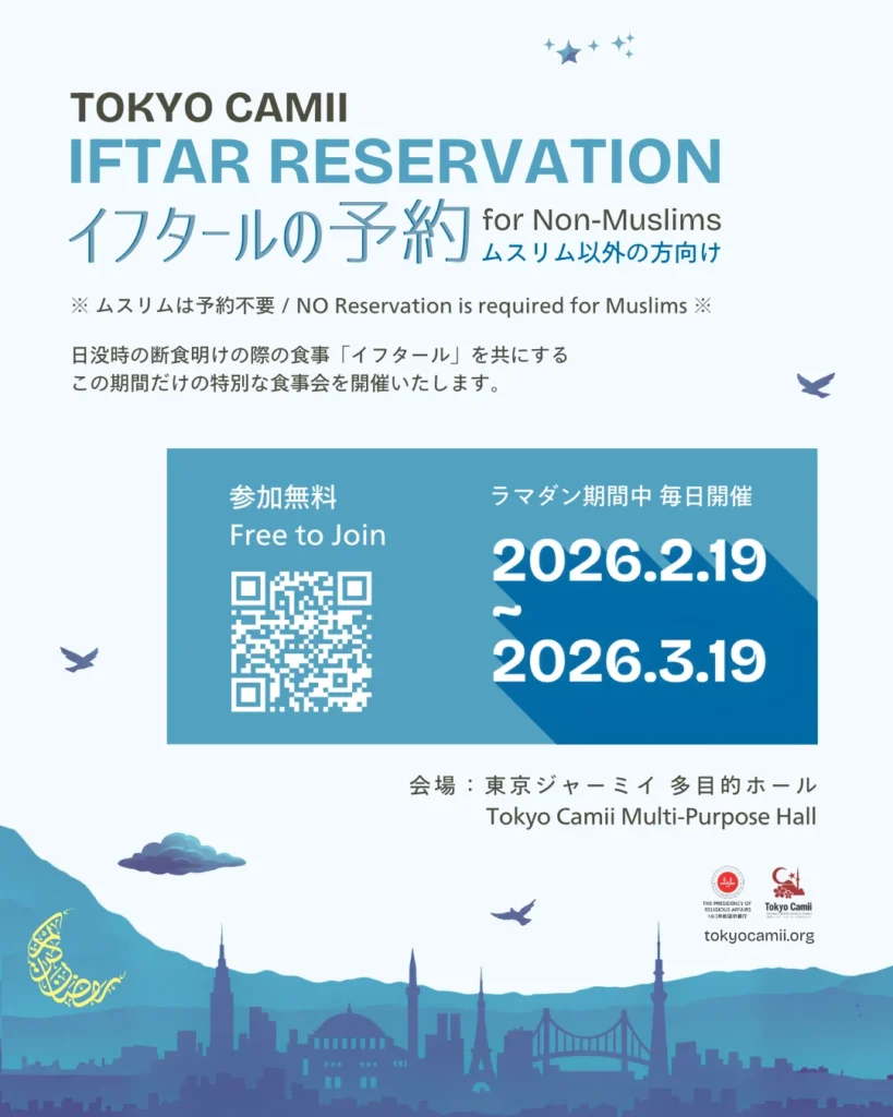 Iftar program will be held every night at Tokyo Camii from Thursday, February 19th, 2026. We sincerely look forward to your participation in this event.