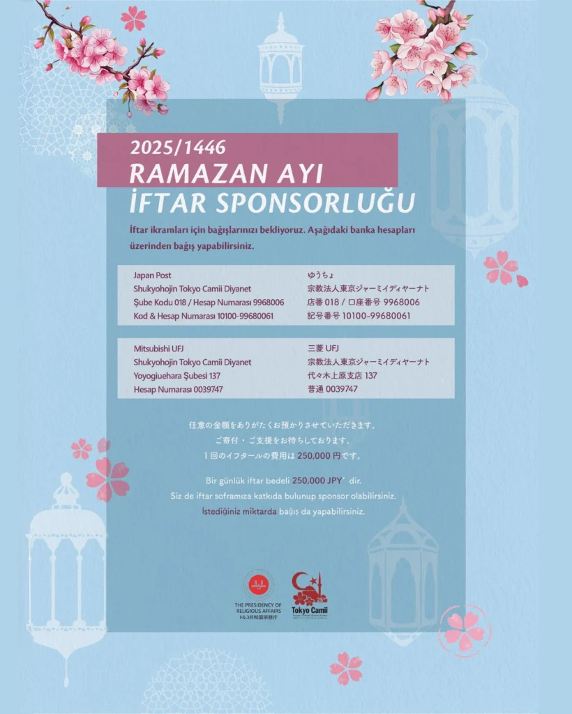 Her yıl olduğu gibi bu yıl da Tokyo Camii’nde Ramazan ayı boyunca iftar yemeği verilecektir. Bir iftar bedeli 250,000 yendir. Miktarı fark etmeksizin yapacağınız tüm bağışları memnuniyetle kabul etmekteyiz.